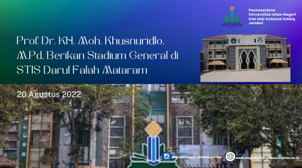 Mataram, NTB – Prof. Dr. KH. Moh. Khusnuridlo, M.Pd, Dosen Magister Manajemen Pendidikan Islam (MPI) UIN KHAS Jember, baru-baru ini menjadi pengisi stadium general di Sekolah Tinggi Ilmu Syariah Darul Falah Pagutan Mataram, Nusa Tenggara Barat. Dalam kesempatan tersebut, beliau membawakan m...