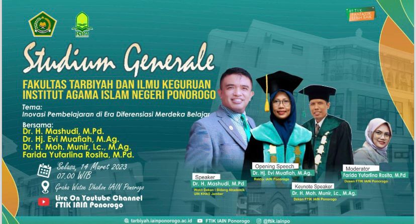Fakultas Tarbiyah dan Ilmu Keguruan (FTIK) Institut Agama Islam Negeri (IAIN) Ponorogo sukses menyelenggarakan Stadium Generale pada Selasa, 14 Maret 2023. Kegiatan ini mengangkat tema "Inovasi Pembelajaran di Era Diferensiasi Merdeka Belajar", dengan menghadirkan narasumber Prof. Dr. H...